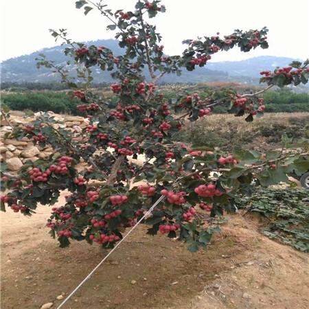 歪把红山楂苗:果实倒卵形,单果重15克左右,肩部较瘦,顶端较肥大,果梗基部一侧着生较肥大的红色肉瘤是其典型特征,果皮鲜红色,有光泽,蜡质较厚,果稀且较大,萼片开张反卷,果面有残存苞片,萼筒陡深,肉质细密软绵,味酸爽口,果实10月上中旬成熟,耐贮性好。树冠紧凑,萌芽率和成枝力均强,花序平均座果率8.9个,适应性强,是加工兼鲜食的优良品种。